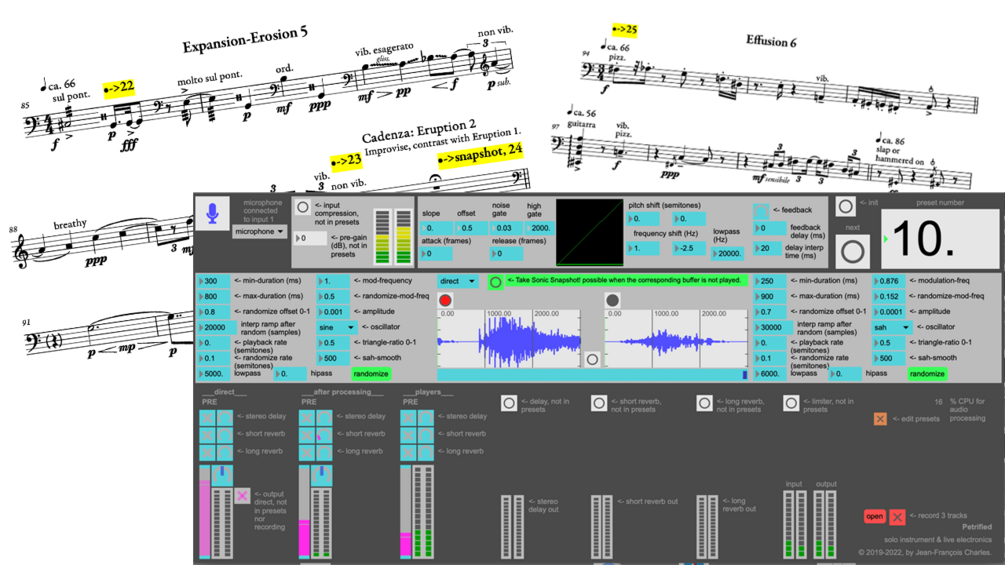 The original program is a set of Max patches and presets, made available as free software: you can redistribute it and/or modify it under the terms of the GNU General Public License as published by the Free Software Foundation, either version 3 of the License, or any later version. The included 2020 version may be used as is with Max on most Apple systems: it makes use of Apple Audio Units such as compression, reverberation, etc. The included 2022 version makes use of external plugins (delay and reverb) that may be replaced by your favorite ones. Both versions of the program may be modified for use on Apple or Windows systems that would not have the same plugins available.